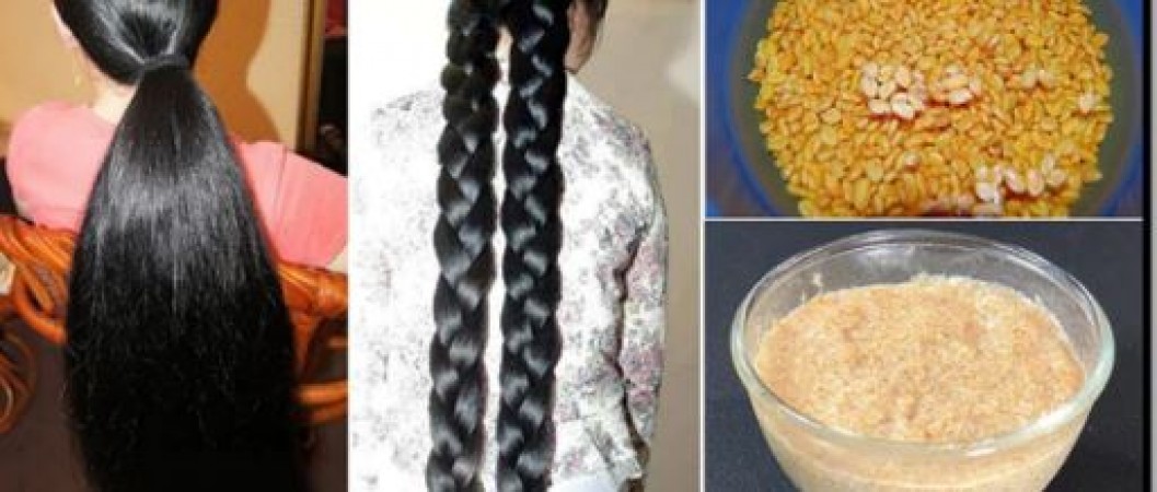 ग्रोथ के लिए- बालों की लंबाई बढ़ाने के लिए एक रात पहले ही मेथी दाने को पानी में भिगोकर रख दें। उसके बाद अगले दिन इन दानों को मिक्सी में पीसकर एक पेस्ट तैयार कर लें। अब इस पेस्ट को बालों में 15-20 मिनट के लिए लगाएं और इसके बाद आप बालों को साफ पानी से अच्छे से धो लें।