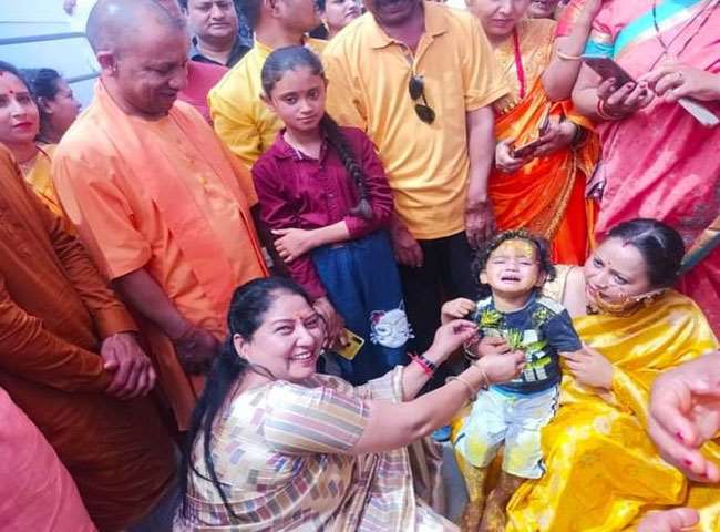 भ्रमण के बाद योगी आदित्यनाथ अपने घर में भतीजे के मुंडन संस्कार में सम्मिलित हुए। मंगलवार रात को घर में सत्यनारायण की कथा तथा केस नूतन का संस्कार संपन्न हुआ। जबकि बुधवार को सुबह बान व मंगल स्नान की रस्म में योगी आदित्यनाथ शामिल हुए। उन्होंने भतीजे अनंत को तिलक व हल्दी लगाकर आशीष दिया। इस दौरान गांव में पारंपरिक बाद्यों की धुन पर ग्रामीणों व महिलाओं ने नृत्य भी किया। योगी आदित्यनाथ में नृत्य और संगीत का बैठकर आनंद लिया।