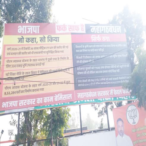 बीजेपी के मुख्य प्रदेश कार्यालय के बाहर लगे बड़े पोस्टर में लिखा है – जो कहा सो किया। महागठबंधन के लिए उन्होंने लिखा है – सिर्फ ठगा। इस पोस्टर में भाजपा और महागठबंधन के बीच में लिखा गया है- फर्क साफ है। भाजपा ने अपनी उपलब्धियां को गेरुए रंग में लिखा है, वहीं महागठबंधन की नाकामियों को काले रंग से लिखा है। इस पोस्टर में एक-एक करके भाजपा ने अपनी सारी उपलब्धियों को बताया है। वहीं, महागठबंधन की नाकामियों को सिलसिलेवार तरीके से लिखा गया है। पोस्टर के अंत में बीजेपी ने अपने बारे में लिखा है, भाजपा सरकार का काम बेमिसाल। वहीं, महागठबंधन के बारे में पोस्टर में लिखा गया है कि महागठबंधन सरकार में केवल फर्जी दावे।