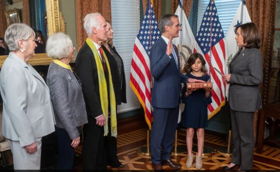 लॉस एंजिल्स के पूर्व मेयर एरिक गार्सेटी को एक समारोह के दौरान उप राष्ट्रपति कमला हैरिस द्वारा भारत में अमेरिकी राजदूत के रूप में आधिकारिक तौर पर शपथ दिलाई गई। अमेरिकी सीनेट ने इस महीने की शुरुआत में गार्सेटी के नामांकन की पुष्टि की थी। जिससे प्रमुख राजनयिक पद भरने के लिए दो साल से अधिक का लंबा अंतराल समाप्त हो गया।