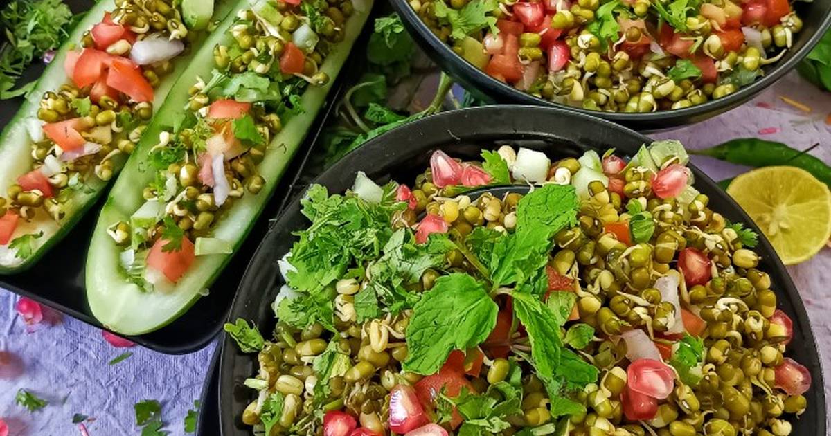बिना छिलके वाली मूंग की दाल को करीब दो घंटा पानी में भिगोकर रख दें। फिर इसे अच्छी तरह से धो लें। अब इस मूंग की दाल को आधे घंटे के लिए खौलते पानी में डालकर छोड़ दें। इससे ये मूंग की दाल थोड़ा पक जाएगी और इसके जरूरी न्यूट्रिशन आसानी से पच सकेंगे। अब किसी गहरे बाउल में मूंग की दाल को निकाल लें। इसमे बारीक कटा टमाटर, बारीक कटा खीरा, घिसा हुआ गाजर, मनचाही सब्जियां जैसे पत्तागोभी, ब्रोकली, कॉर्न भी डाल सकती हैं। सब सब्जियों को डालने के बाद इसमे काला नमक और थोड़ा सा सादा नमक डालकर मिक्स करें।