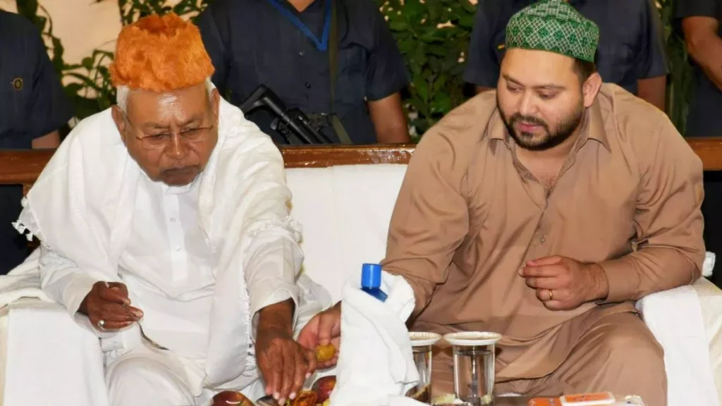 बिहार में रामनवमी पर हिंसा के बाद अब इफ्तार पार्टी पर राजनीति तेज है। रविवार को पूर्व मुख्यमंत्री राबड़ी देवी के आवास पर आयोजित दावत-ए-इफ्तार में मुख्यमंत्री नीतीश कुमार के संग महागठबंधन के बड़े नेताओं का जुटान हुआ।इफ्तार पार्टी की तस्वीरें सोशल मीडिया पर वायरल हुई, तो नीतीश कुमार और तेजस्वी यादव के पहनावा राजनीतिक गलियारे में चर्चा का विषय बन गया।