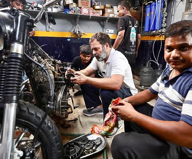 राहुल गांधी ने दिल्ली के करोलबाग में मोटरसाइकिल मैकेनिकों की वर्कशाप का किया दौरा..