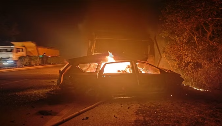 कार सामने से आ रहे डंपर में जाकर टकरा गई। जोरदार आवाज के साथ कार में आग लग गई। कार को डंपर करीब 25 मीटर घसीटता हुआ ले गया। इससे डंपर के अगले हिस्से में भी आग लग गई। डंपर के ड्राइवर और हेल्पर घबराहट में कूदकर फरार हो गए।