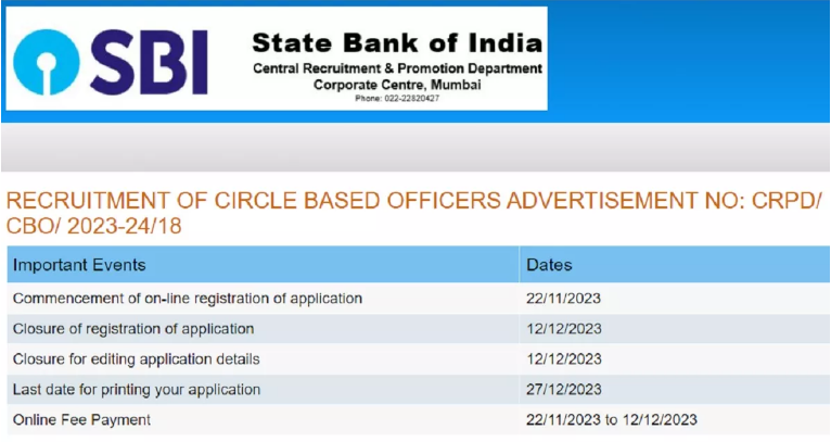 एसबीआइ में सर्किल बेस्ड ऑफिसर्स के कुल 5280 पदों पर भर्ती (SBI CBO Recruitment 2023) की जानी है। इस भर्ती के लिए आवेदन के दौरान उम्मीदवारों को 750 रुपये शुल्क का भुगतान भी करना होगा जिसकी आखिरी तारीख 12 दिसंबर 2023 ही है। साथ ही इसी तारीख तक उम्मीदवारों को अपने आवेदन में किसी प्रकार का त्रुटि सुधार या संशोधन भी करना होगा।
