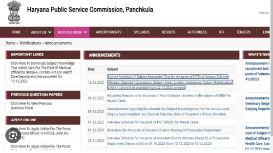 सबसे पहले उम्मीदवारों को हरियाणा लोक सेवा आयोग (HPSC) की आधिकारिक वेबसाइट https:// hpsc.gov.in/ पर जाना होगा। इसके बाद, आधिकारिक वेबसाइट के होमपेज पर महत्वपूर्ण लिंक सेक्शन पर जाएं। अब होम पेज पर विभिन्न विषयों (भौतिकी, रसायन विज्ञान, अर्थशास्त्र, जीव विज्ञान, हिंदी, अंग्रेजी, वाणिज्य, इतिहास, गणित) में पीजीटी के पदों के लिए विषय ज्ञान परीक्षा की संशोधित सूची लिंक पर क्लिक करें। आपको संशोधित शेड्यूल की पीडीएफ एक नई विंडो में मिल जाएगी। इसे अपनी एग्जाम डेट्स चेक करें और फिर भविष्य के संदर्भ के लिए इसे डाउनलोड करें और सहेजकर रख लें।