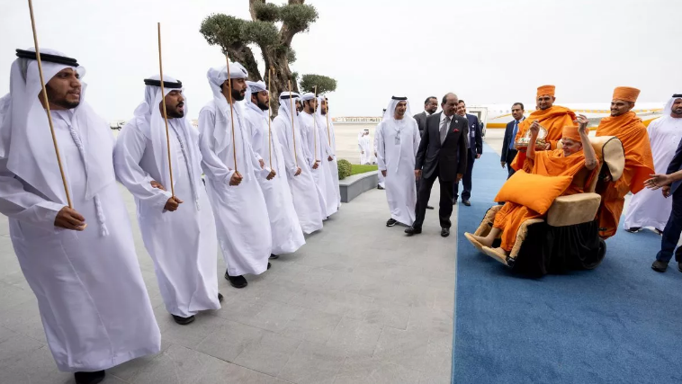 महंत स्वामी महाराज का संयुक्त अरब अमीरात के सहिष्णुता मंत्री शेख नहयान मबारक अल नहयान ने राज्य अतिथि के रूप में गर्मजोशी से स्वागत किया। आध्यात्मिक गुरु का स्वागत करते हुए मंत्री ने कहा, “यूएई में आपका स्वागत है। हमारा देश आपकी उपस्थिति से धन्य है। हम आपकी दयालुता से प्रभावित हैं और हम आपकी प्रार्थनाओं को महसूस करते हैं।
