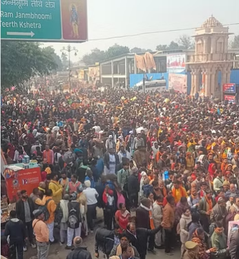 राम जन्मभूमि पथ पर भक्तों का रेला लगा हुआ है। श्रद्धालुओं के सामान रखने व जांच करने की व्यवस्था भी भारी भीड़ के चलते फेल हो गई है। बड़ी संख्या में श्रद्धालु सामान व मोबाइल सहित राम जन्मभूमि में प्रवेश कर जा रहे हैं। लाकर की व्यवस्था नाकाफी साबित हो रही है। दोपहर 12:00 बजे तक 70, 000 से अधिक श्रद्धालु रामलला के दरबार में हाजिरी लगा चुके हैं। राम जन्मभूमि पथ पर जगह-जगह श्रद्धालुओं के जूते चप्पल पड़े हुए हैं।