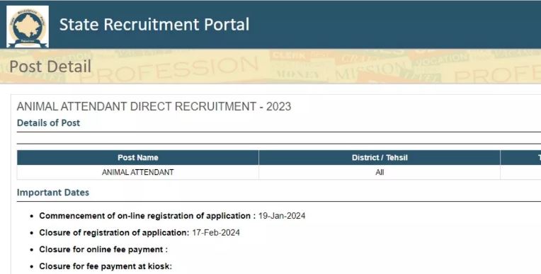 राजस्थान एनिमल अटेंडेंट वैकेंसी के लिए ऑनलाइन आवेदन करने के इच्छुक कैंडिडेट्स के लिए अहम सूचना है। राजस्थान कर्मचारी चयन बोर्ड (RSMSSB) की ओर से इस भर्ती के लिए आज, 17 फरवरी, 2024 को ऑनलाइन आवेदन विंडो बंद कर दिया जाएगा। इसलिए, जिन कैंडिडेट्स को इस भर्ती के लिए अप्लाई करना है, वे फौरन ऐसा कर दें। अंतिम तिथि बीतने के बाद कोई आवेदन पत्र स्वीकार नहीं किया जाएगा। अप्लाई करने के लिए अभ्यर्थियों को आधिकारिक वेबसाइट recruitment.rajasthan.gov.in पर जाकर आवेदन करना होगा।