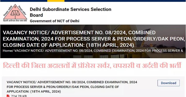 दिल्ली में सरकारी नौकरी के इच्छुक उम्मीदवारों के लिए काम की खबर। दिल्ली की जिला अदालतों और पारिवारिक न्यायालयों में विभिन्न पदों पर भर्ती के लिए अधिसूचना दिल्ली अधीनस्थ सेवा चयन आयोग (DSSSB) द्वारा जारी की गई है। बोर्ड द्वारा हाल ही में 12 मार्च को जारी विज्ञापन (सं.08/2024) के अनुसार जिला व पारिवारिक न्यायालयों में प्रॉसेस सर्वर, चपरासी / अर्दली / डाक चपरासी के कुल 102 पदों पर भर्ती (Delhi District Court Recruitment 2024) की जानी है।