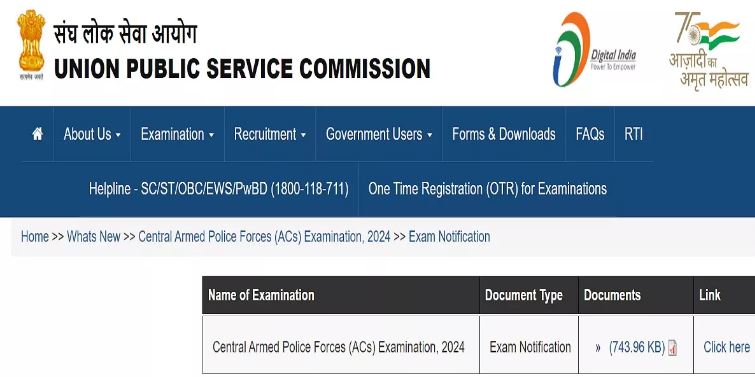 यूनियन पब्लिक सर्विस कमीशन (UPSC) की ओर से सेंट्रल आर्म्ड पुलिस फोर्स (असिस्टेंट कमांडेंट) एग्जामिनेशन 2024 के लिए नोटिफिकेशन जारी कर आवेदन प्रक्रिया आज यानी 24 अप्रैल से शुरू कर दी गई है। नोटिफिकेशन के अनुसार इस भर्ती के लिए ऑनलाइन माध्यम से फॉर्म निर्धारित अंतिम तिथि 14 मई 2024 तक भरा जा सकता है।